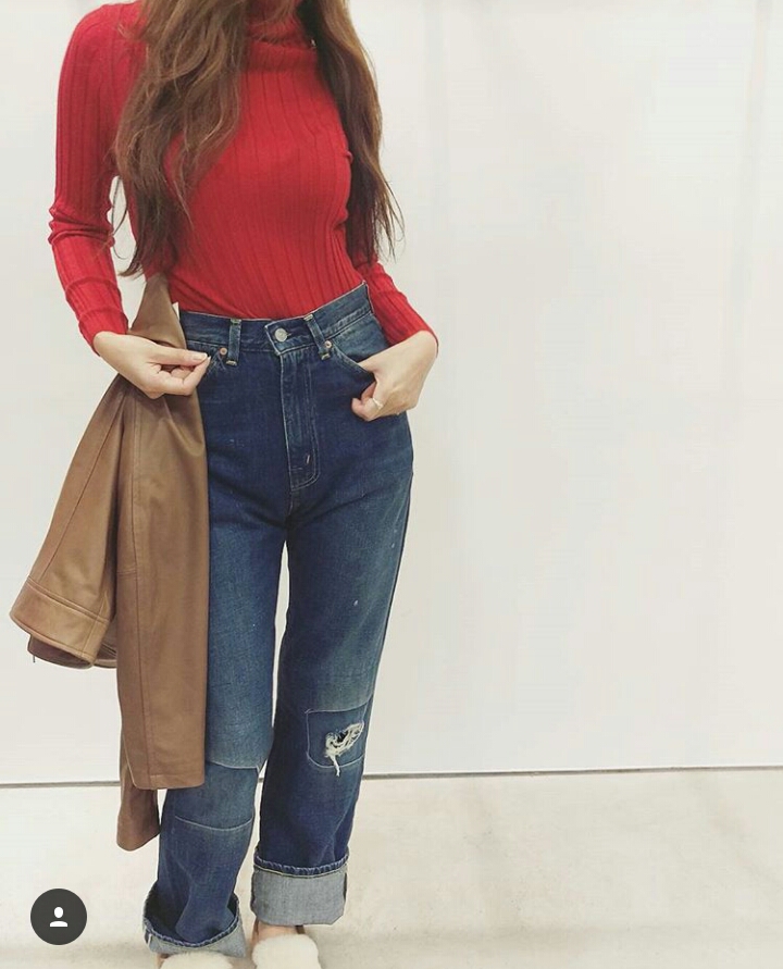 鮮やかな赤のリブニットはレトロヴィンテージに着ると今年流に󾬍