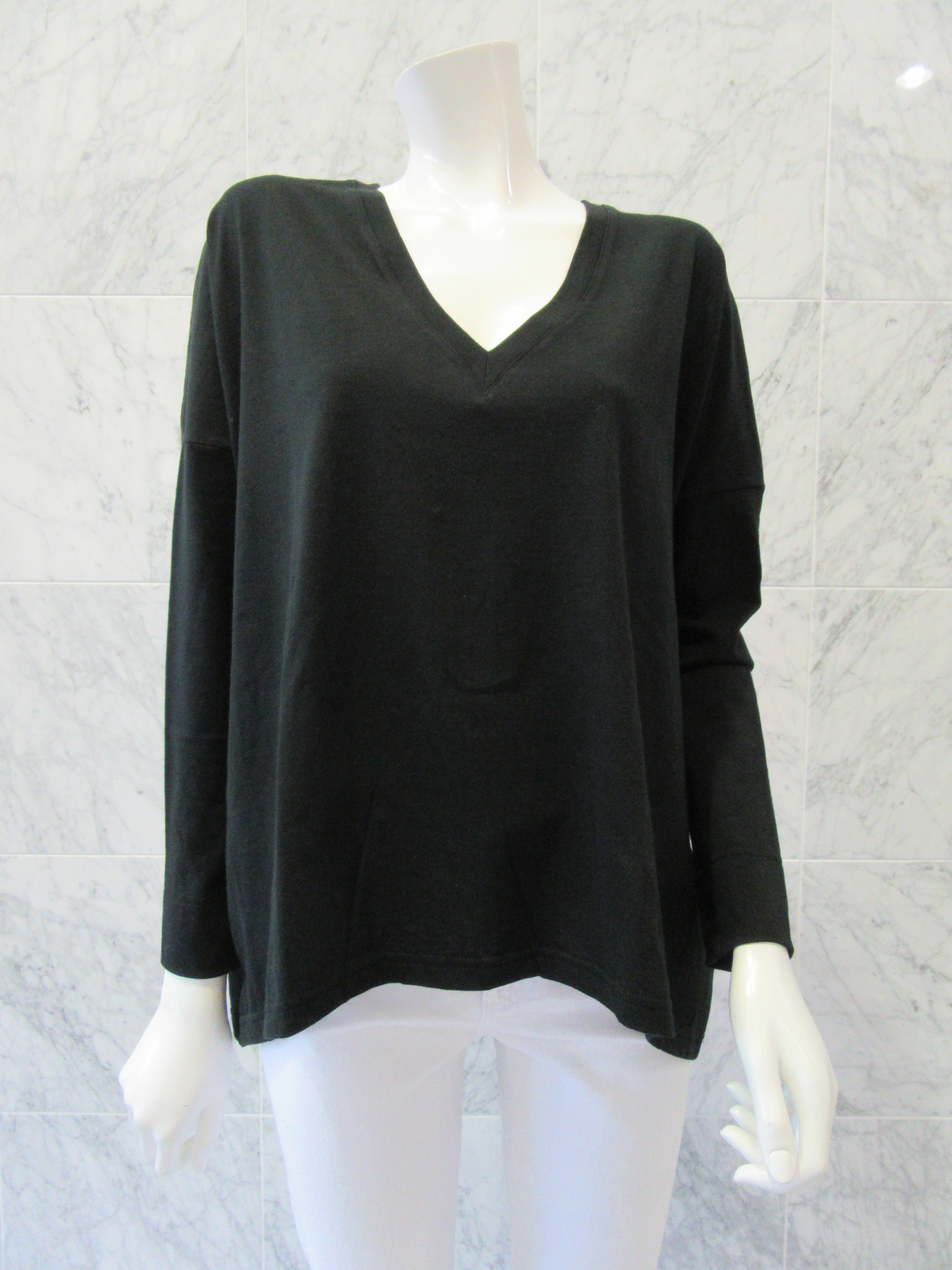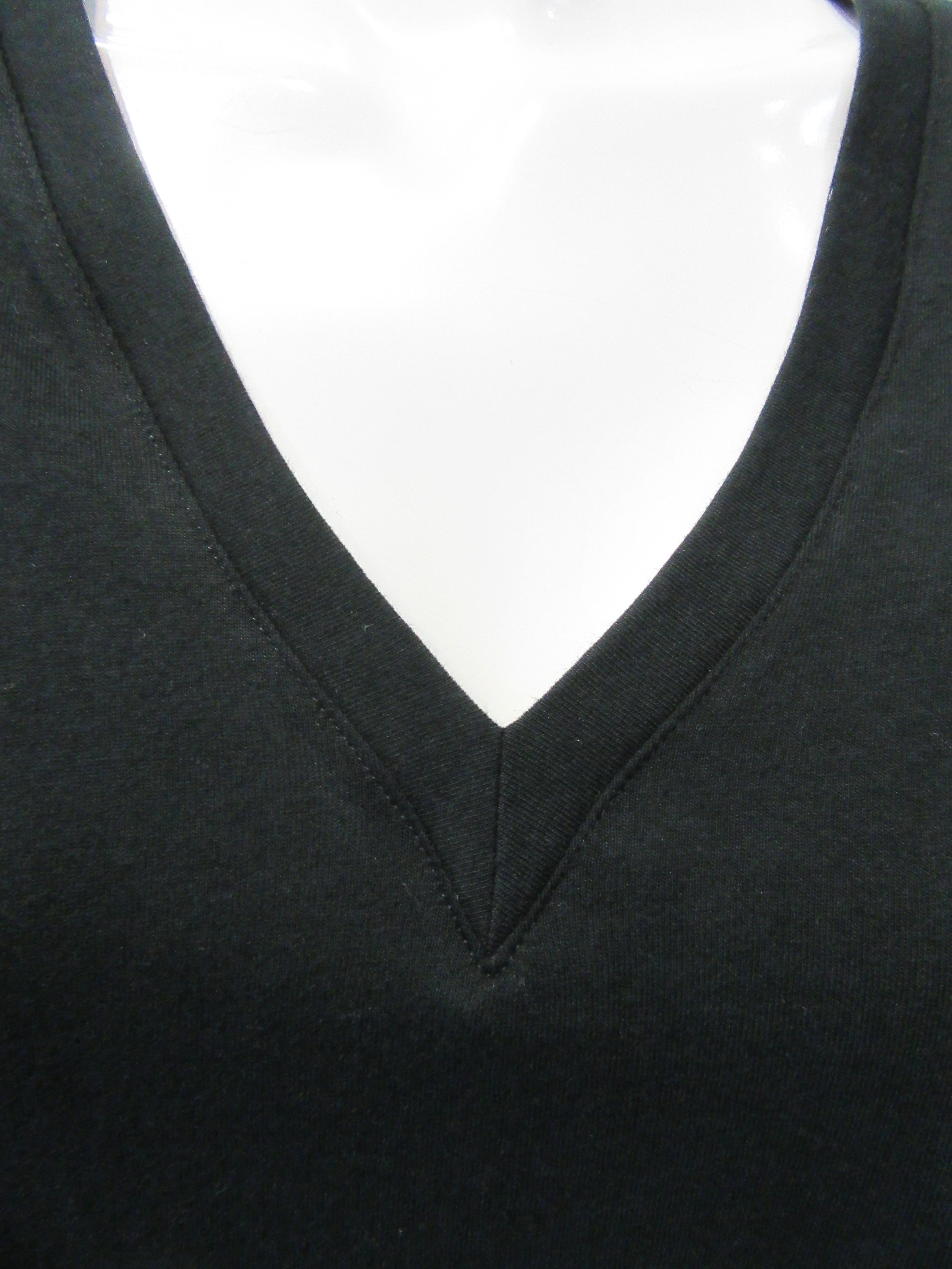 天幅が狭く深めのVネックにする事で、首を細く長く見せる効果をプラスしています。