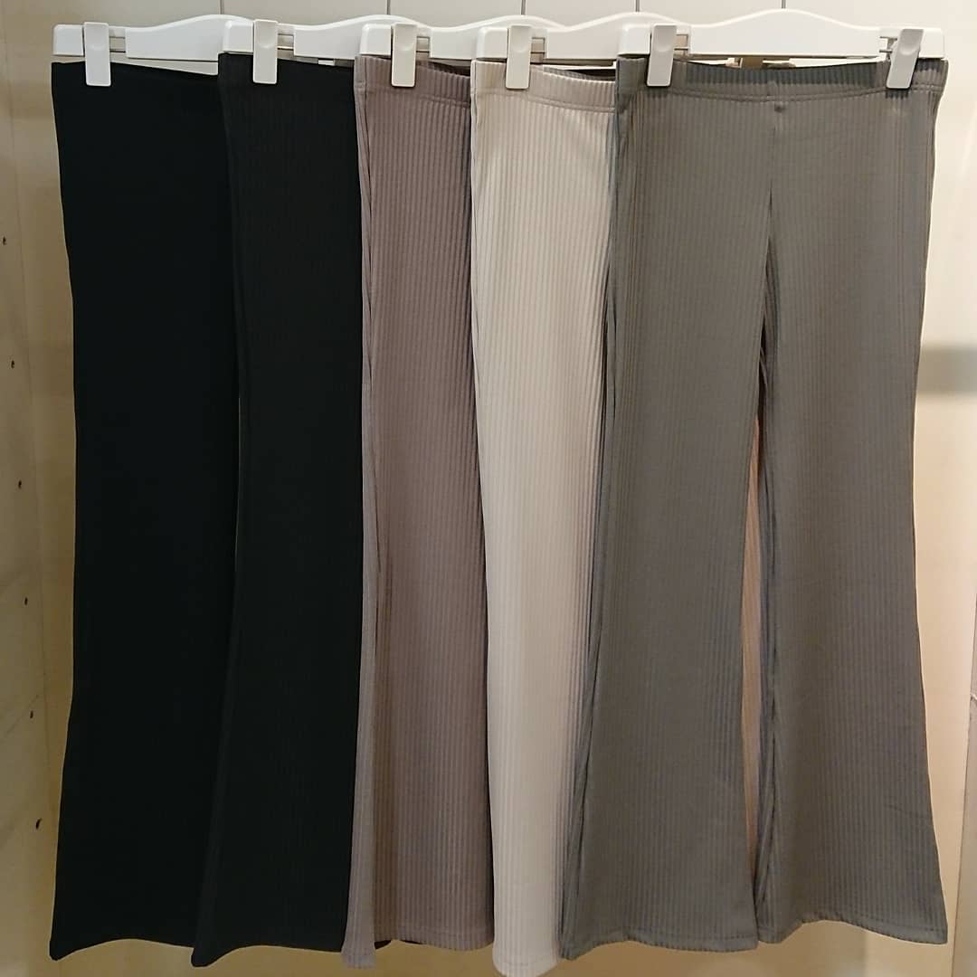 清涼感のあるストレッチリブ素材の オリジナルフレアパンツ 楽チンでシワになりにくく気軽にはいて頂けるので おうち時間にもおすすめです✨ こちらの商品はオンラインショップでも
