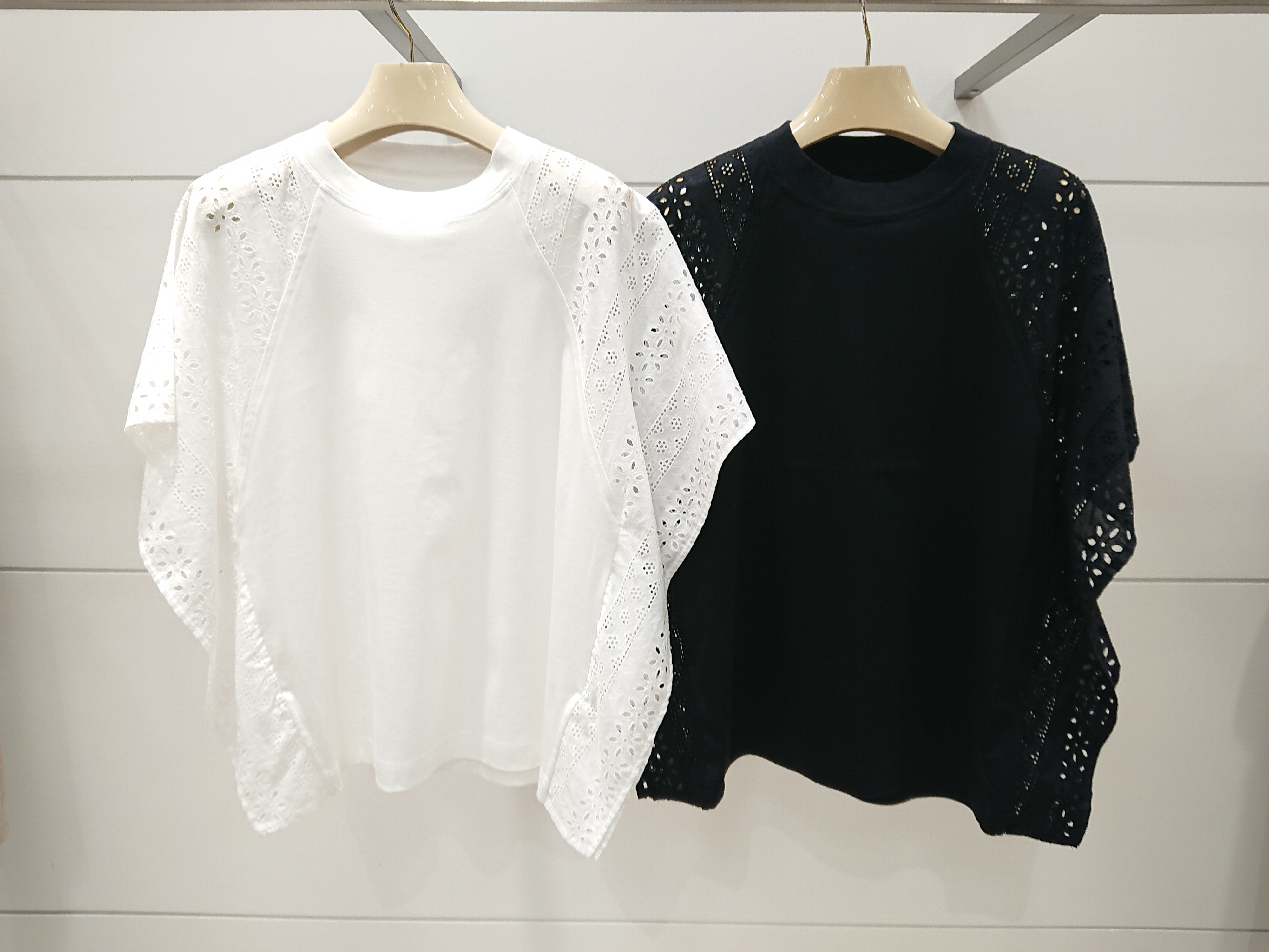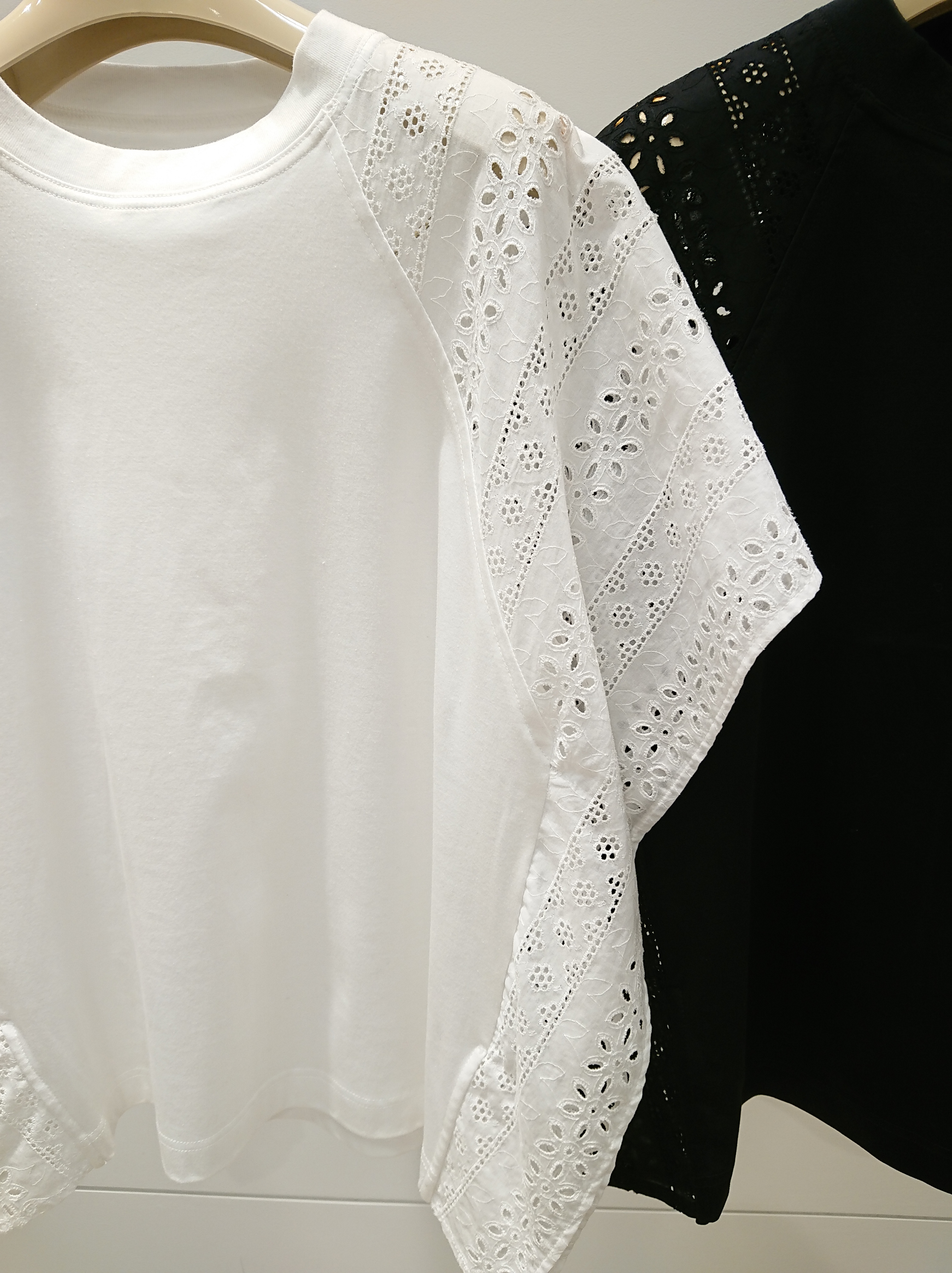 肩からサイドに施されたアイレットレースはフェミニンでいて身頃がカットソー素材なのでカジュアルに楽しめるアイテムです🙆