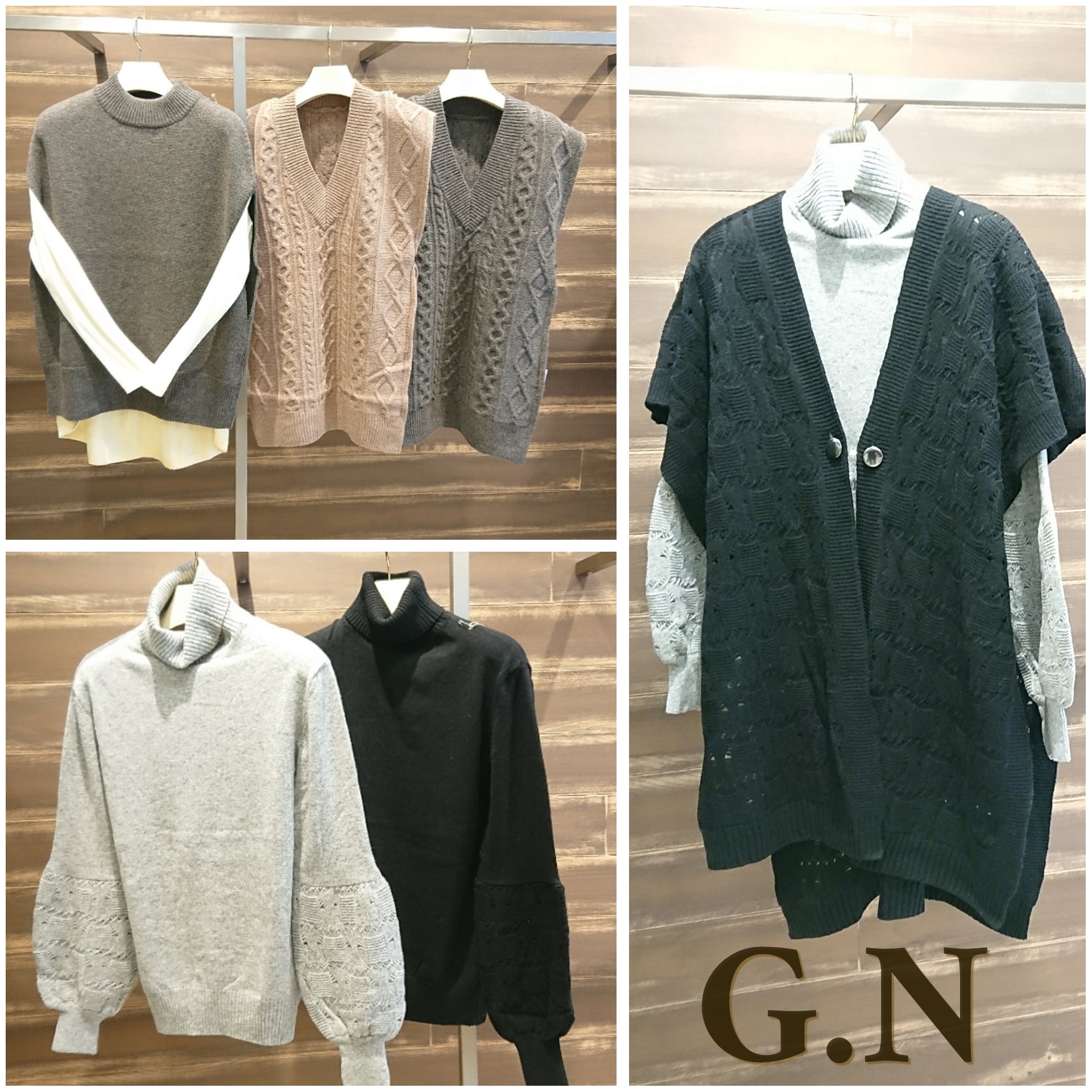 ポンチョ風のベストや袖が編み柄になったタートルセーターはシンプルながら個性的です(写真では編み柄が見えにくいですが…)