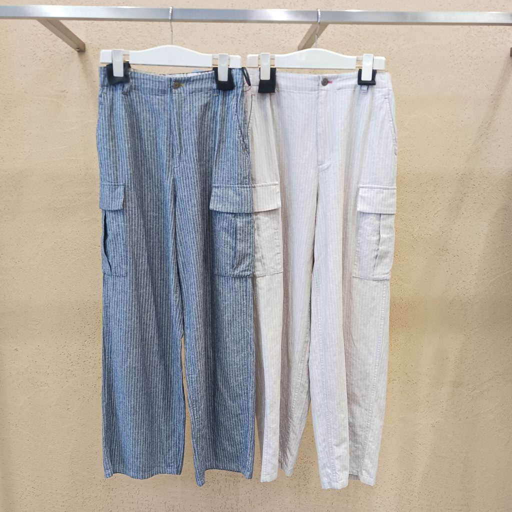 リラックス感のあるストライプ柄カーゴパンツは麻混真夏も快適に着用できます☺️
