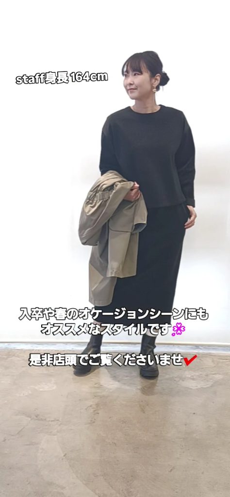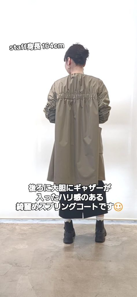 後ろに大胆なギャザーが施されたスプリングコートはハリ感もあり、綺麗めな印象に…✨