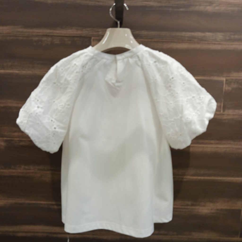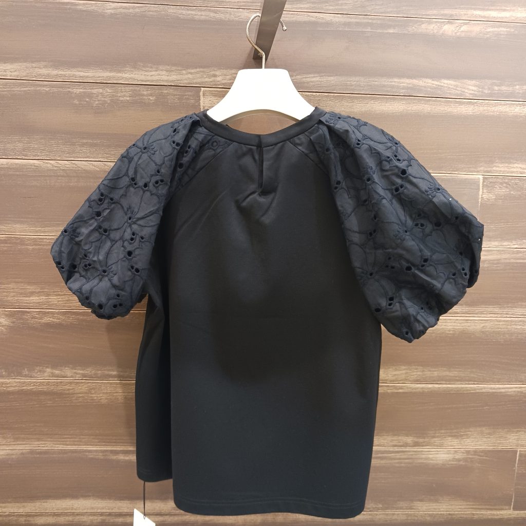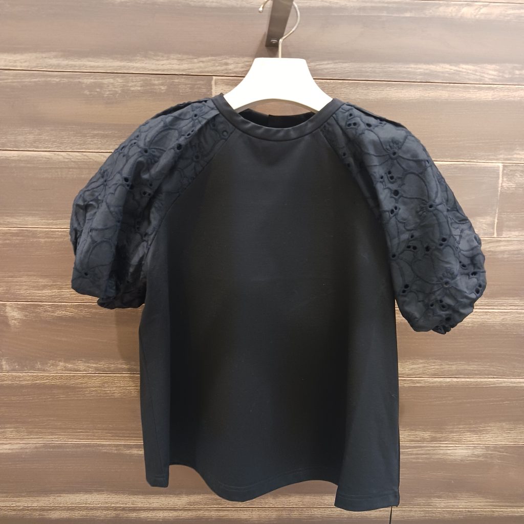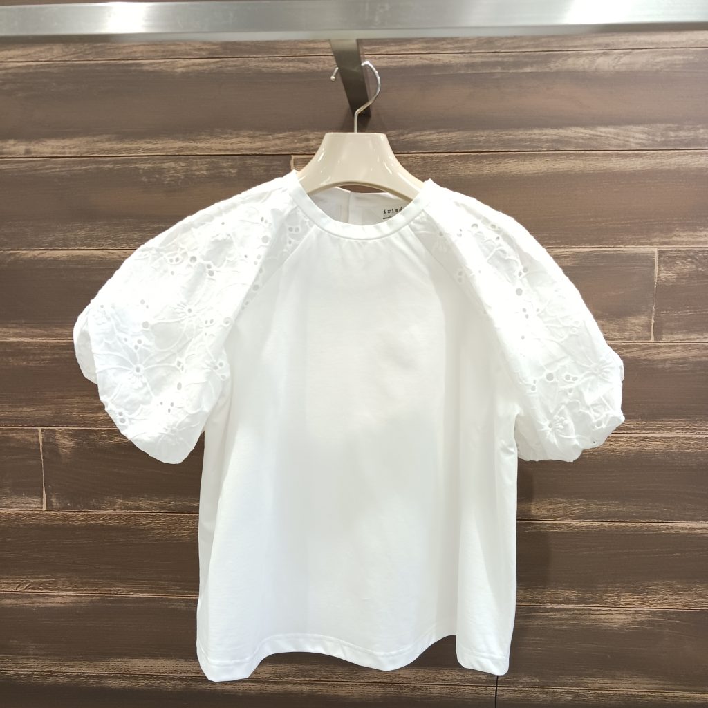 袖はボーラー刺繍生地でボリュームをもたせています。刺繍があることにより高級感がありブラウス、カットソーどちらの見え方でも着こなせます。