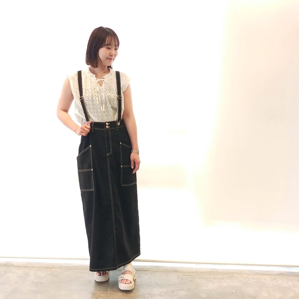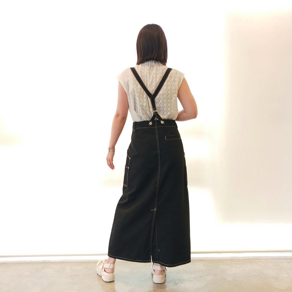 スカートには取り外し可能なサスペンダーとワークポケットが施されており、程よいカジュアル感をプラスしバランスを取りました☝️