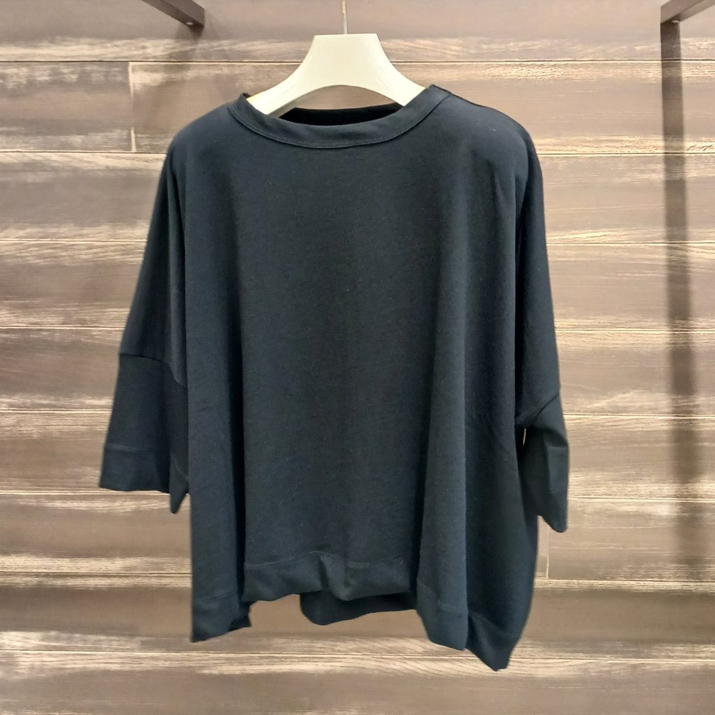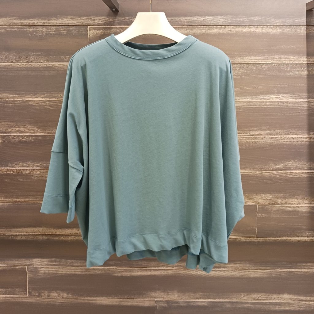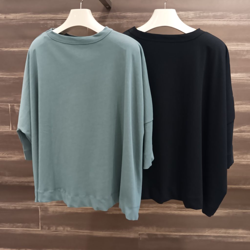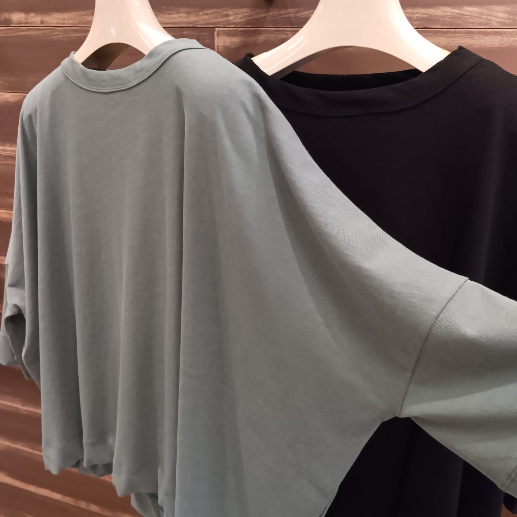 シャリ感のある生地は着心地の良い肌触りです。ドルマンスリーブなので脇にまとつかず快適に着て頂けます😊