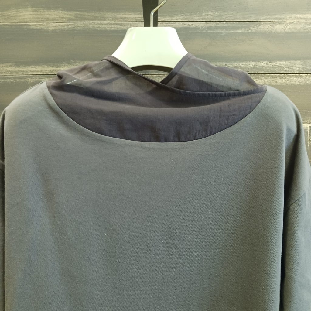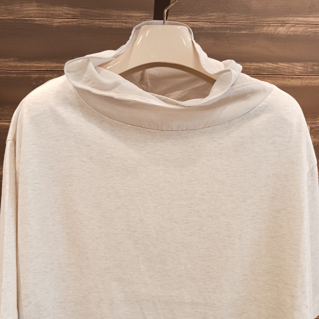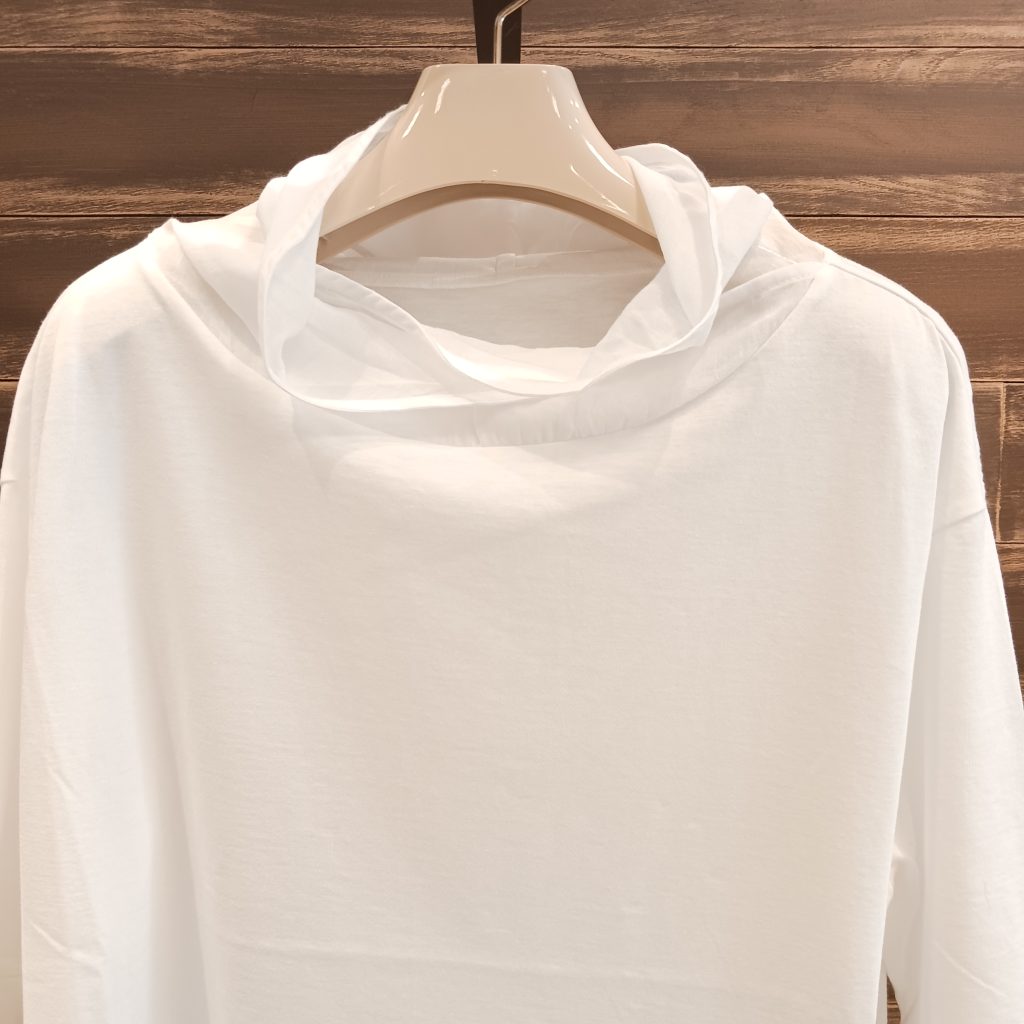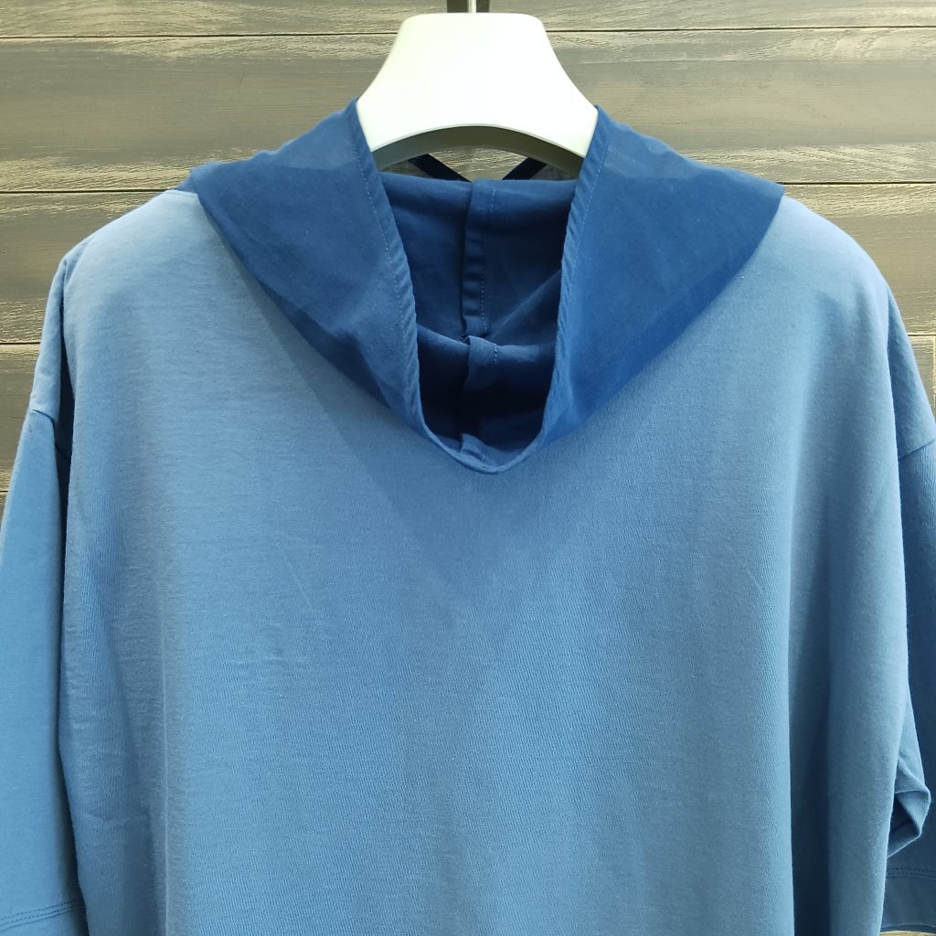 「akane 」(アカネ)より大人気アイテムのフード付きプルオーバーが入荷しました🆕 綿ローンのフード部分は日焼け防止とネックラインをカバーし、サラッとして軽い着心地です🙆 身頃と袖は日本製の綿天竺でゆったりとした分量感で肘まで隠れる袖丈も嬉しいディテールです🌴 夏の一枚着として活躍するカットソーですので是非店頭でご覧くださいませ💚