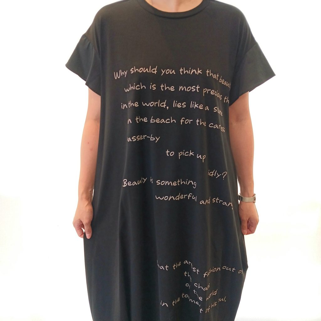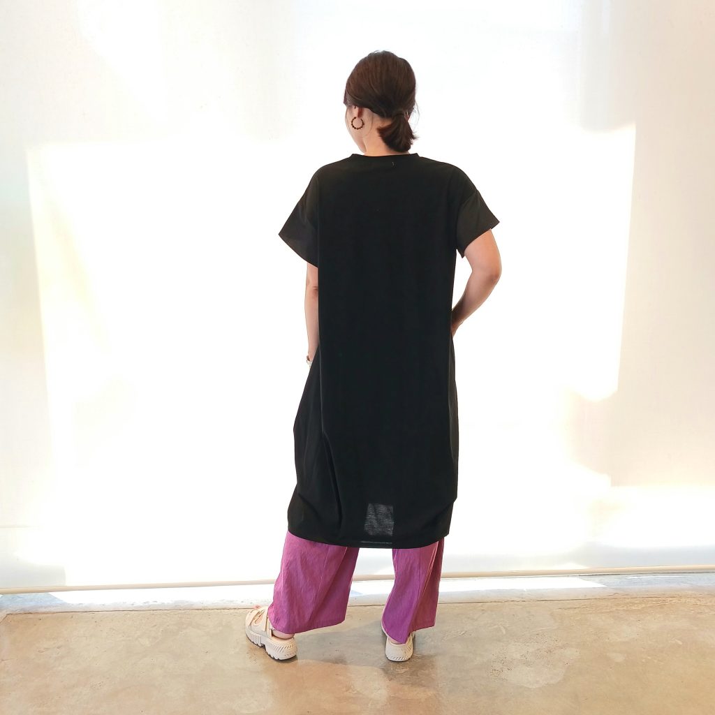 大胆な英字プリントとバルーンシルエットが綺麗なカットソーワンピースにアクセントカラーとして青みピンクのパンツを合わせました🙌