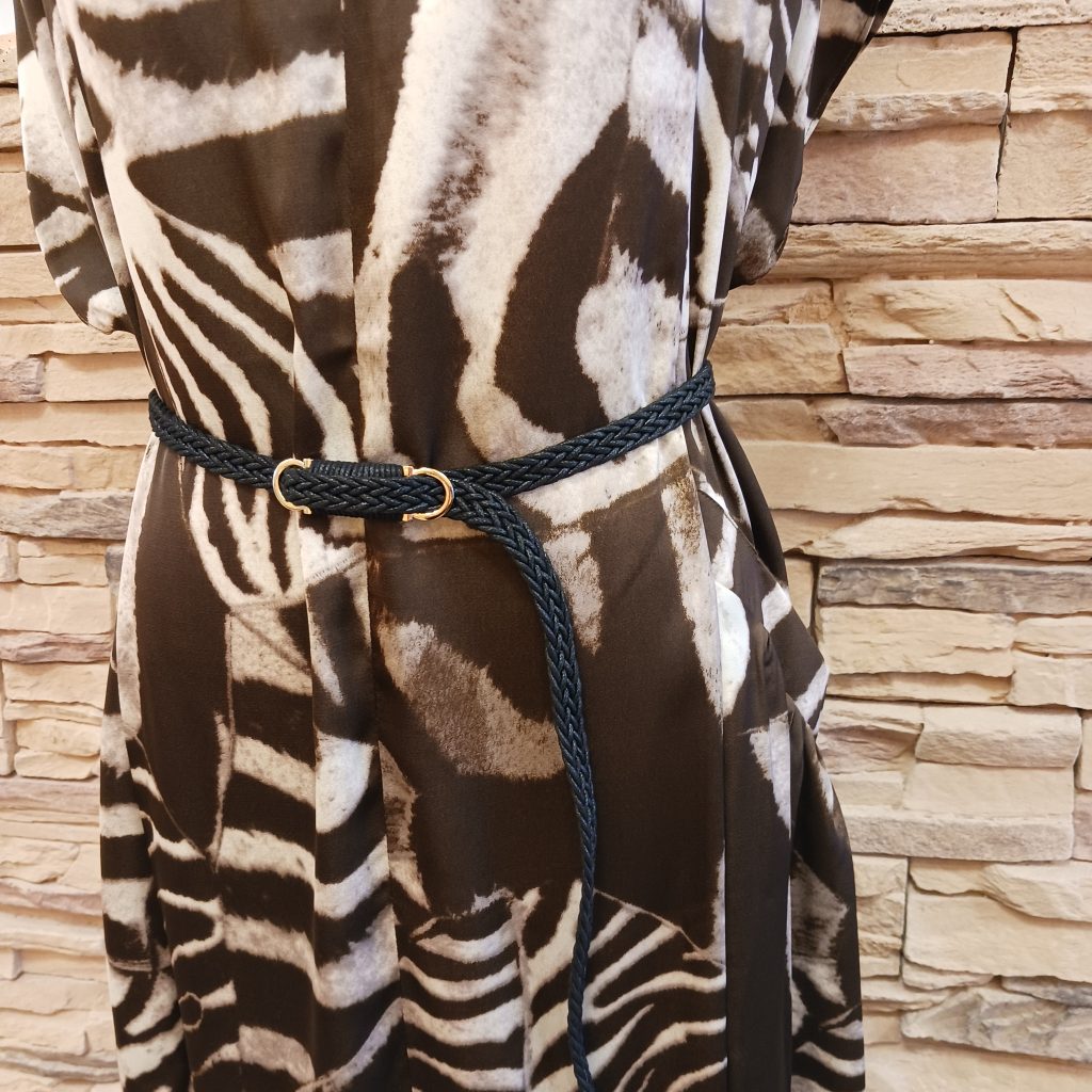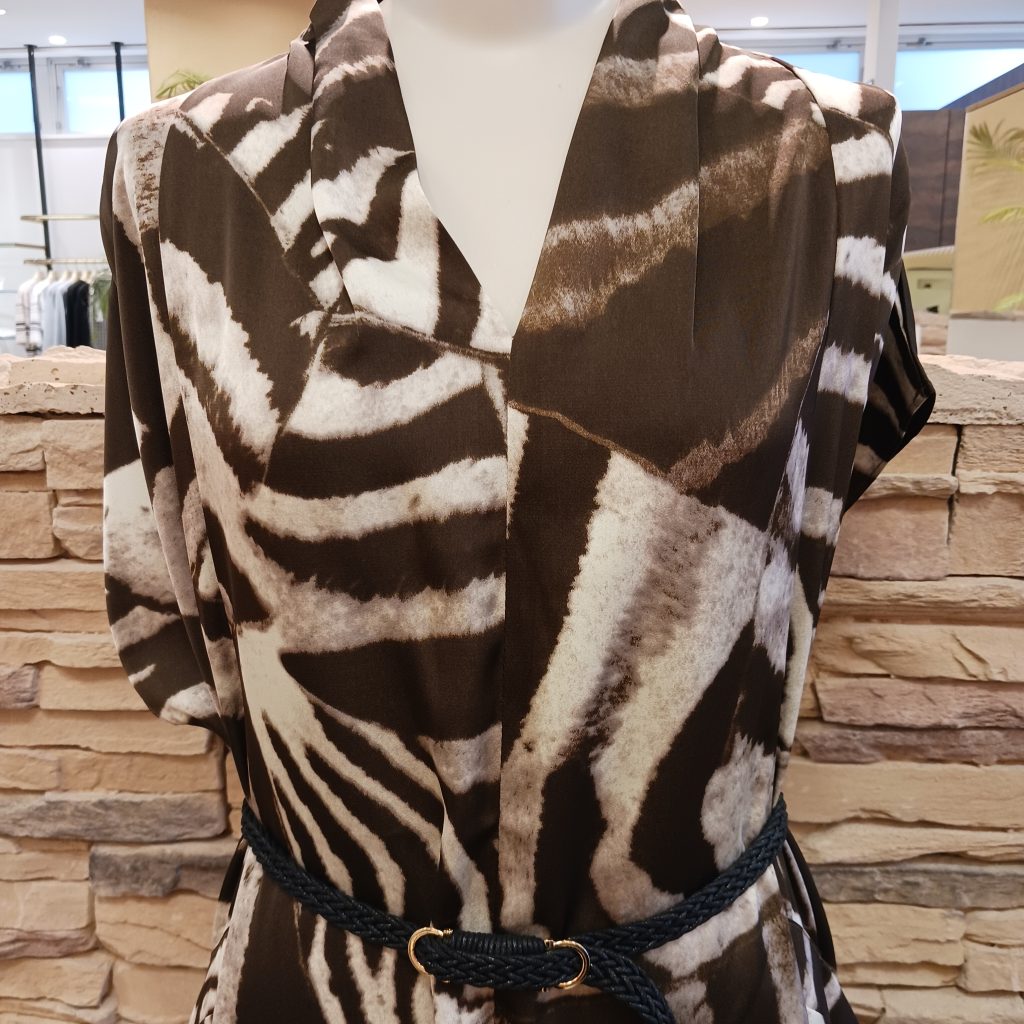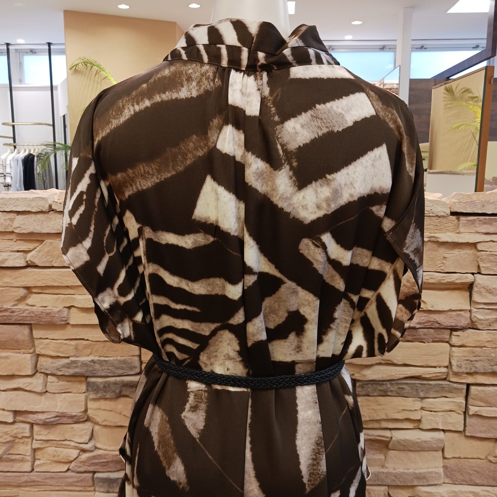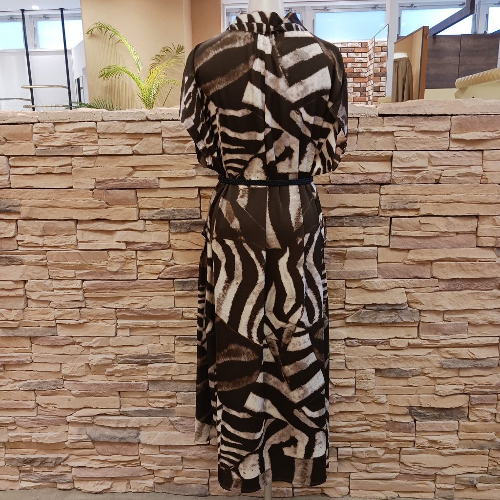焦げ茶色と白の配色で、より大人っぽく上品さのある柄で、ベルト付きによってシルエットを楽しむこともできます🆗