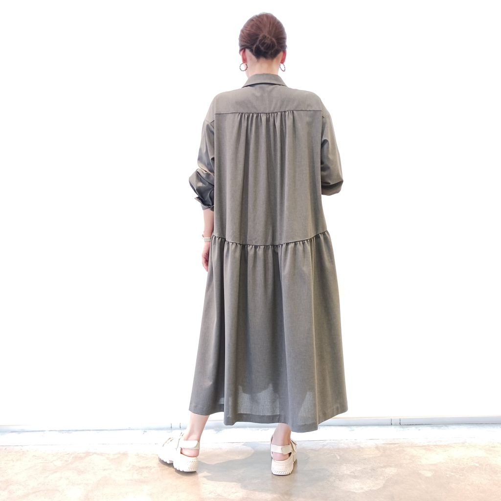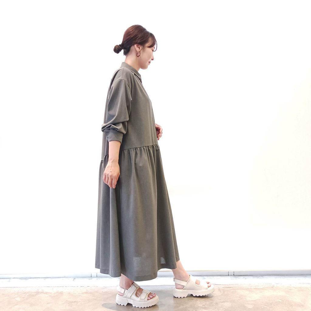ウールのような強撚のポリエステル素材で、綺麗見えする襟付きワンピースです😌 低めのウエスト切り替えで大人っぽく、襟元とスカートのギャザー感が女性らしいデザインです💄