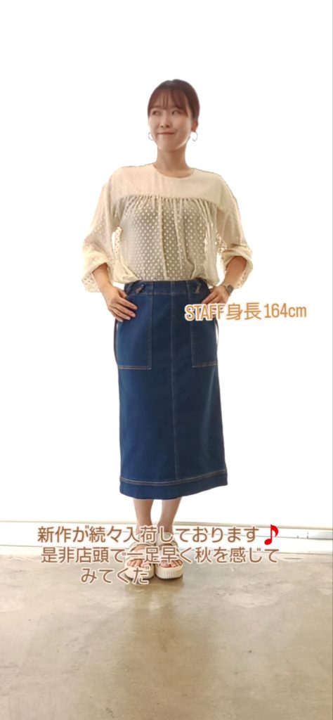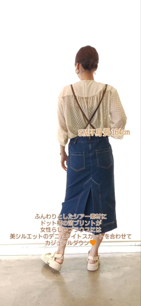 ふんわりと女性らしい雰囲気のシアー素材に箔プリントのドット柄が華やかなブラウスにデニムタイトスカートを合わせてカジュアルダウンしました💛