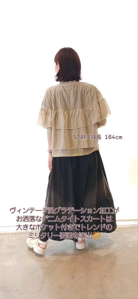 ヴィンテージ風グラデーション加工がお洒落なデニムタイトスカートは大きなポケット付きでトレンドのミリタリー要素を演出🙆