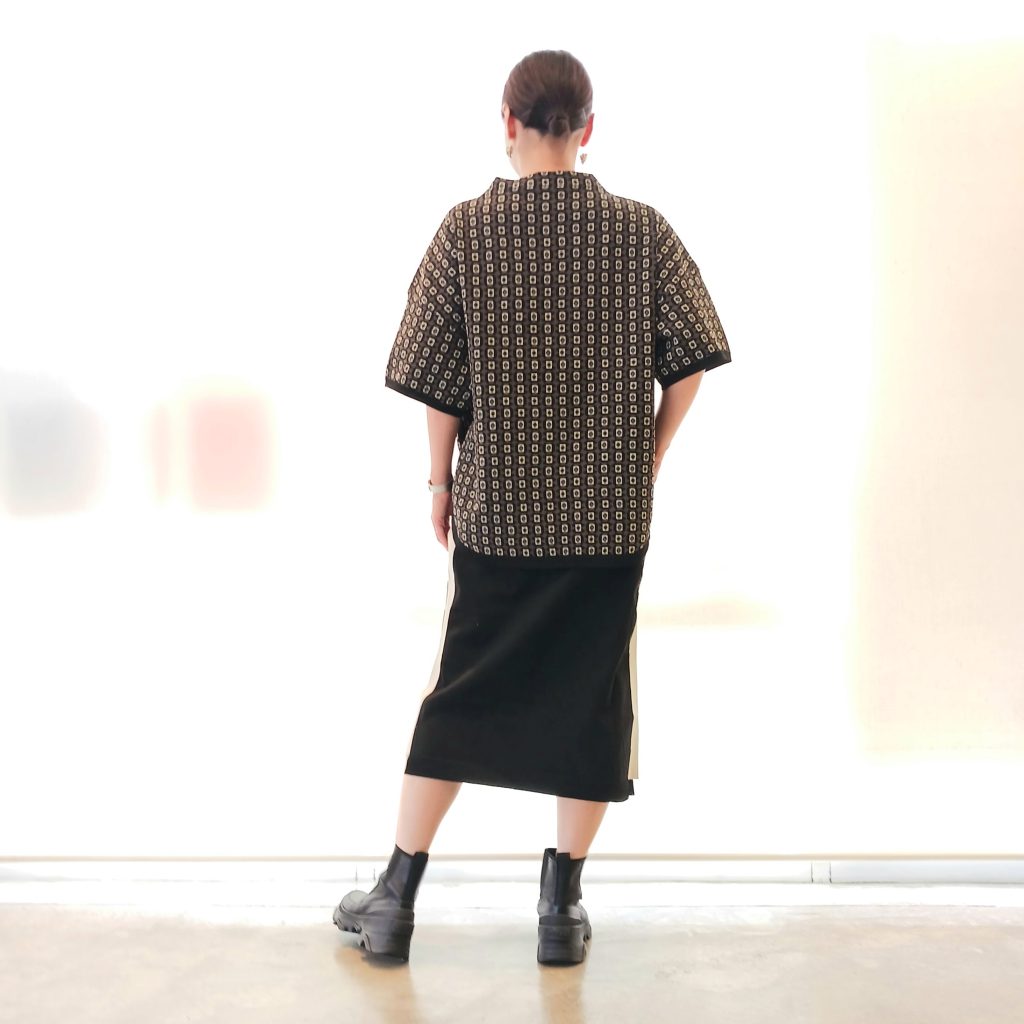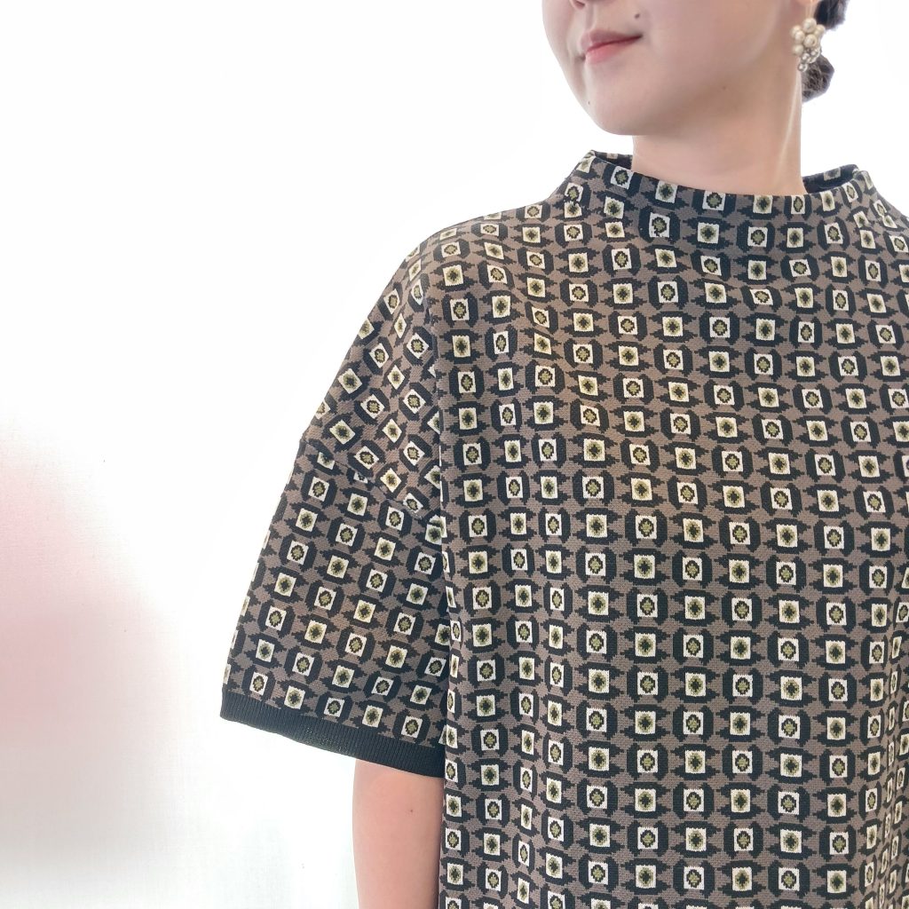 シックなジオメトリー柄トップスとサイドラインが細見え効果のタイトスカートのセットアップはニットとは思えない軽さと柔らかなで素材で心地よい着心地が魅力です💮