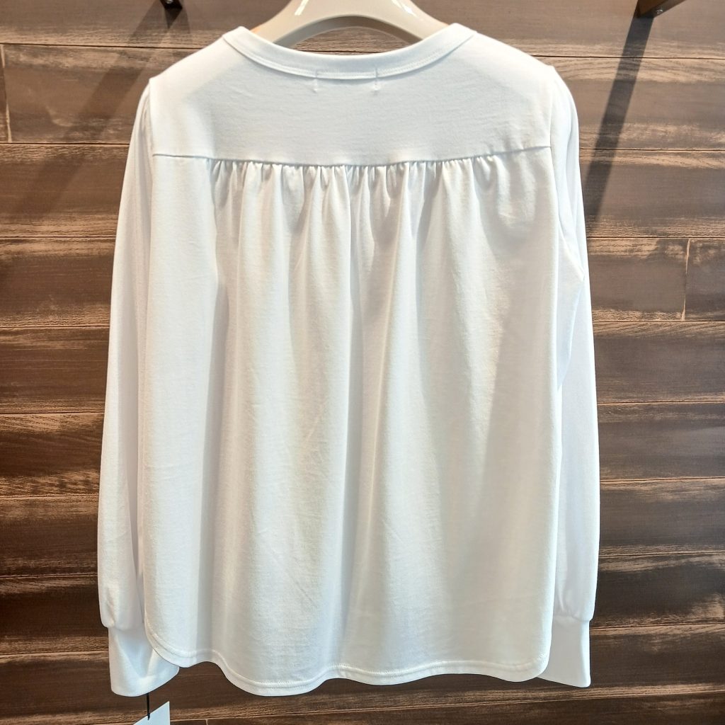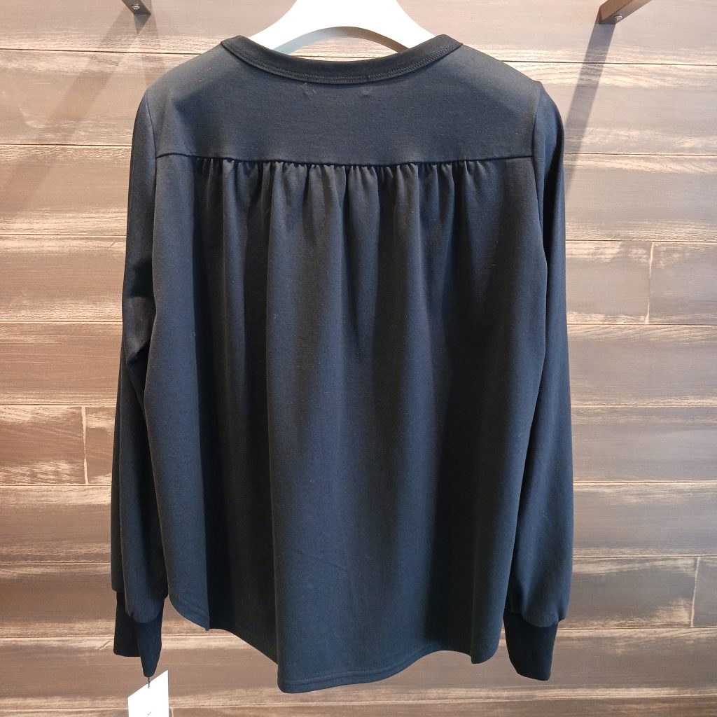 袖口と背中の切り替えギャザーが女性らしく着まわしの効くアイテムです✨