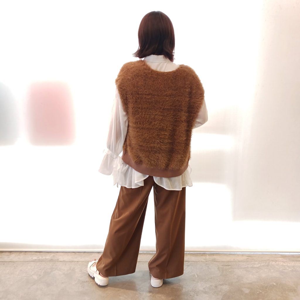 女性らしく、こなれ感のあるフェザーベストとエアリーなシャツとのレイヤードスタイルは都会的でトレンディなスタイルに仕上がります☺️