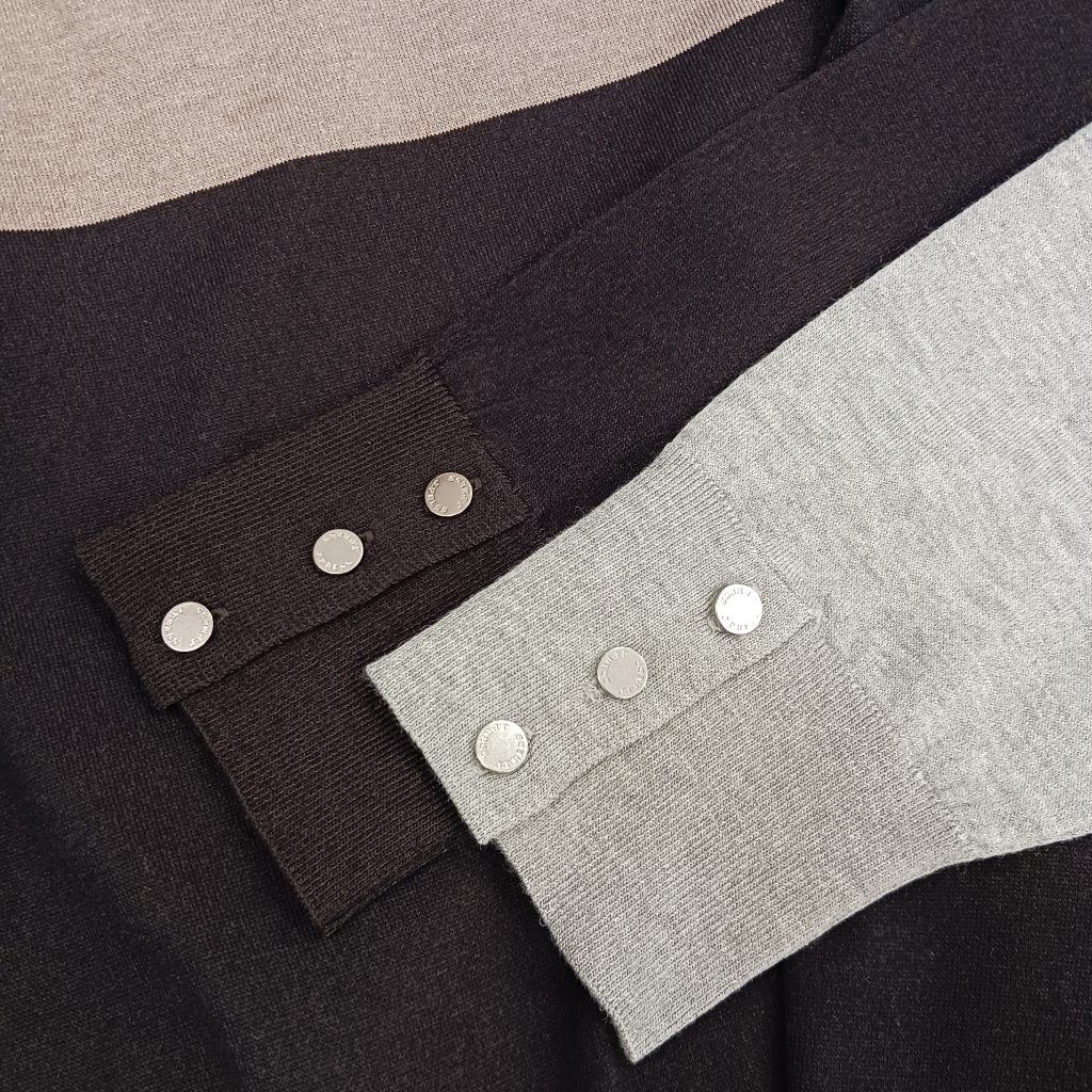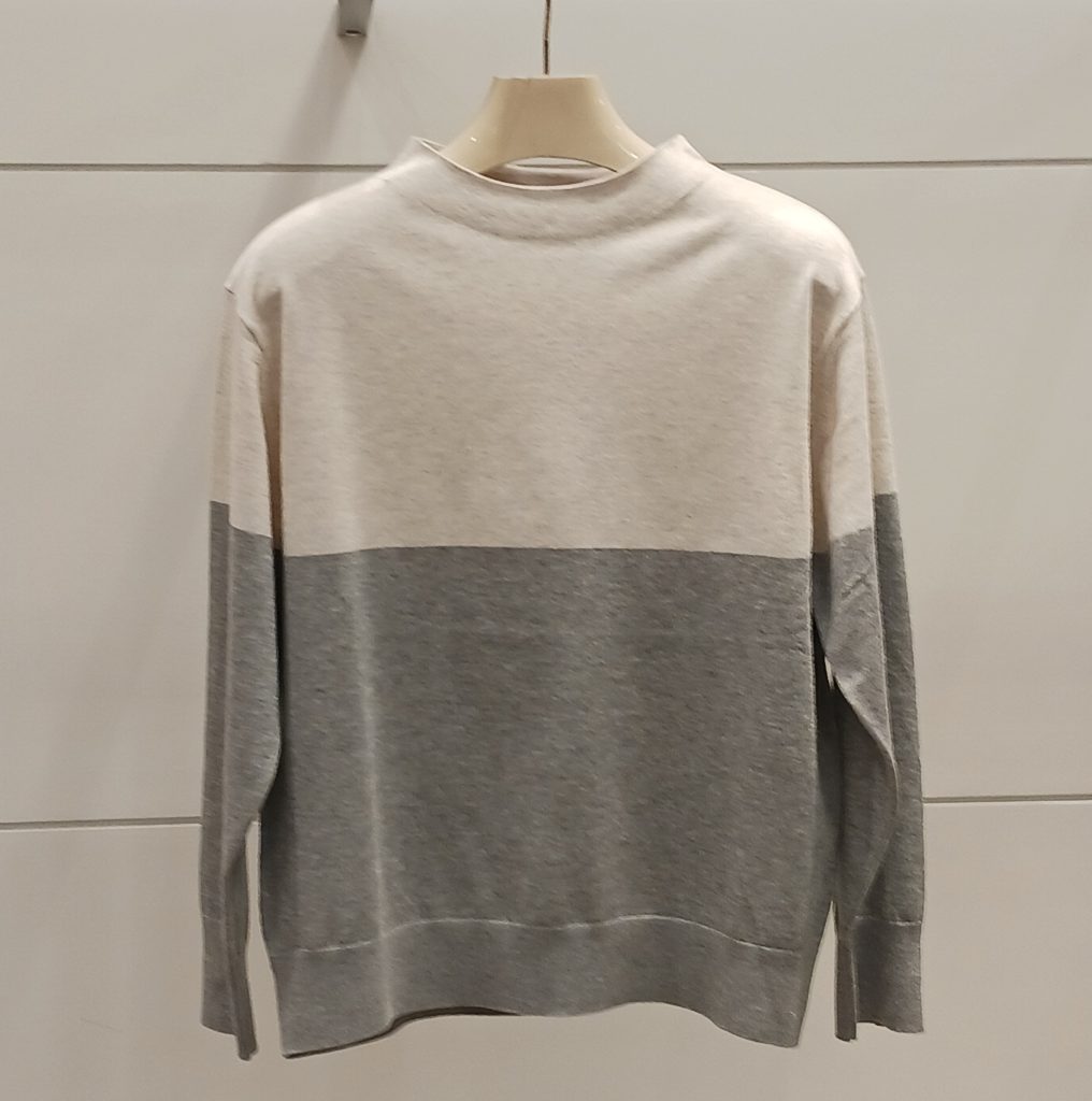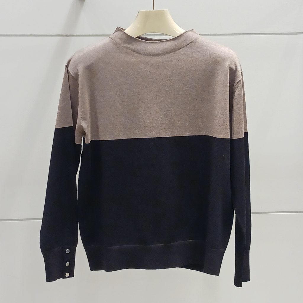 上品なモックネックが印象的なカラーブロッキングニットです。
