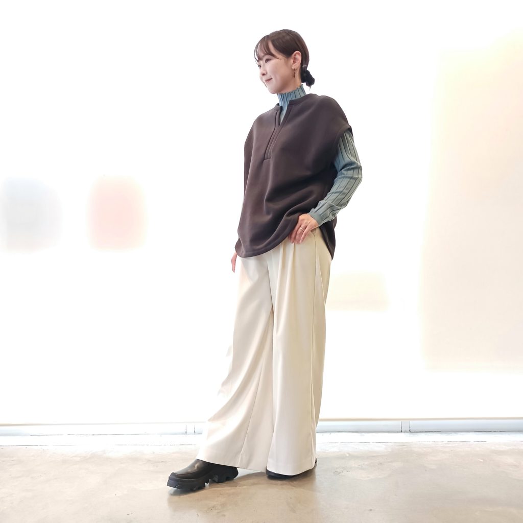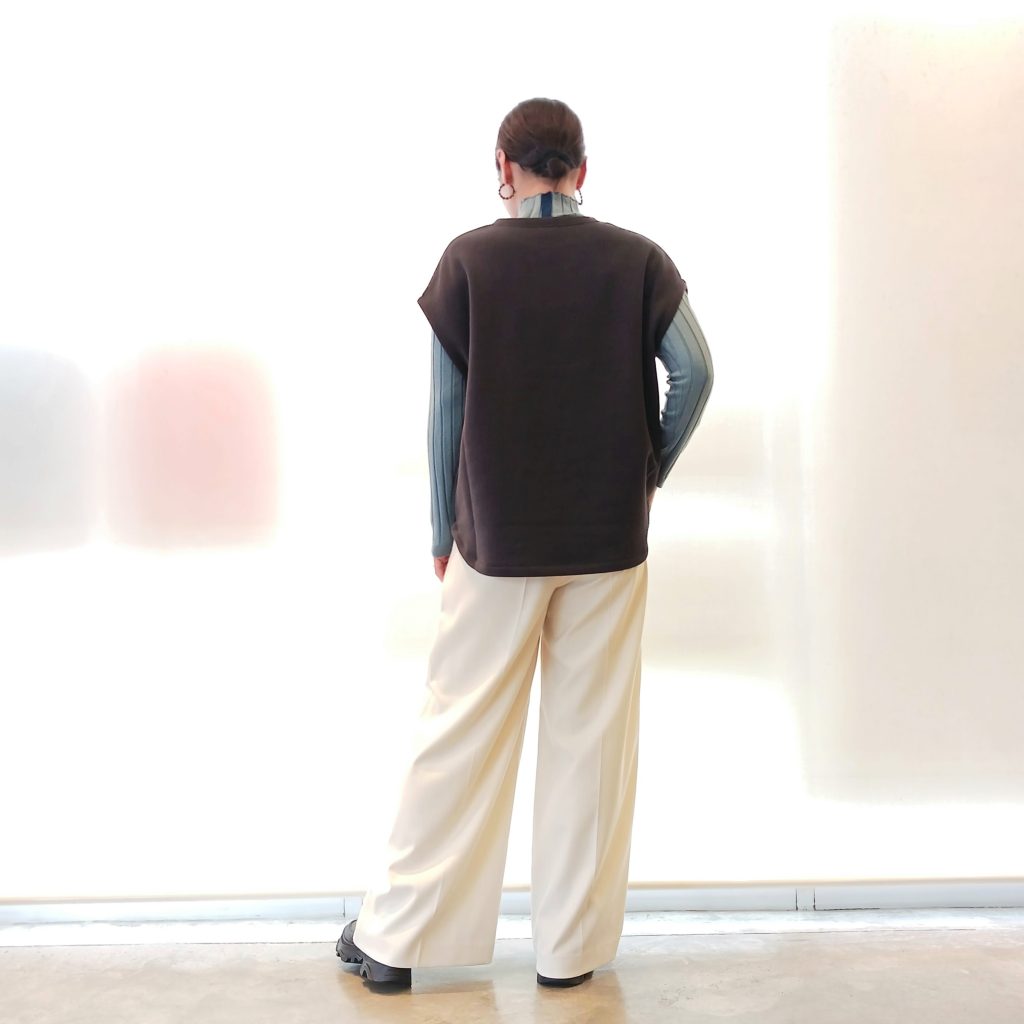 ゆったりとしたシルエットが今っぽく、スタイリッシュに着こなせるベストはカットソーやニットとレイヤードを楽しんでいただけるアイテムです🙆🎵