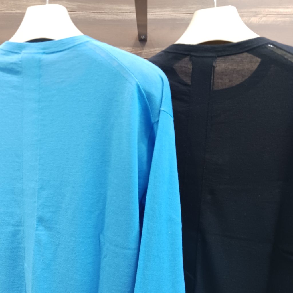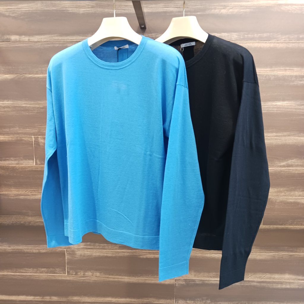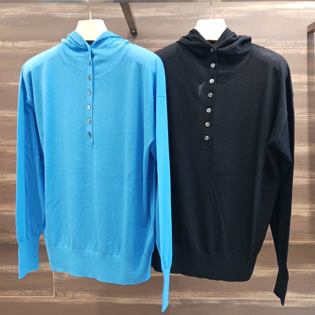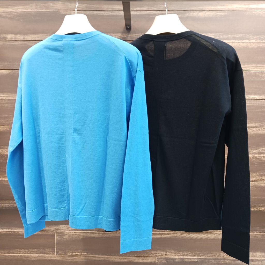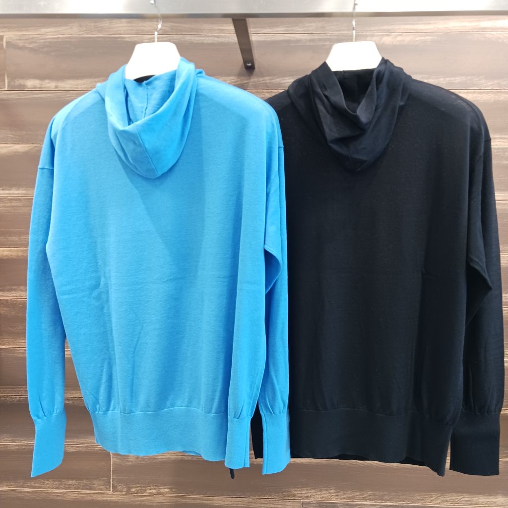 フード付きスキッパープルオーバーと、後ろ中心のベンツあきクルーネックの2 型がご覧いただけますので是非店頭でお試しくださいませ📣