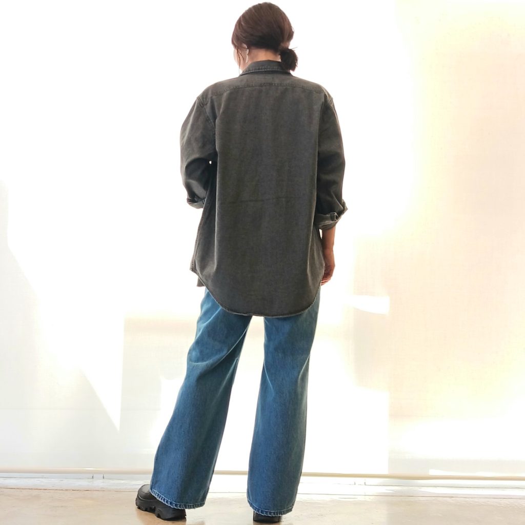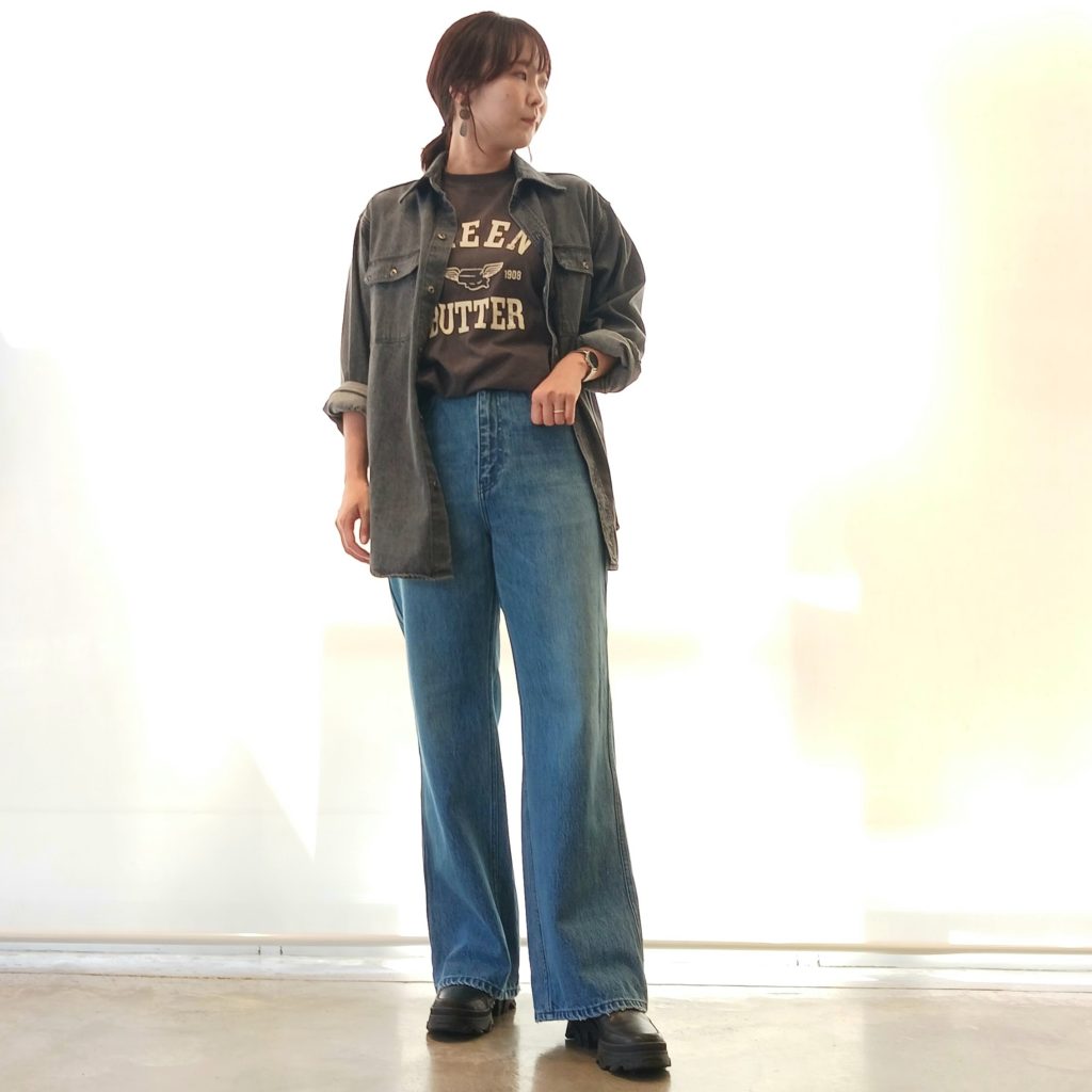 更に美脚効果抜群のセミワイドフレアパンツを合わせることで、カジュアルなのにレディな大人デニムスタイルに仕上がります🎵