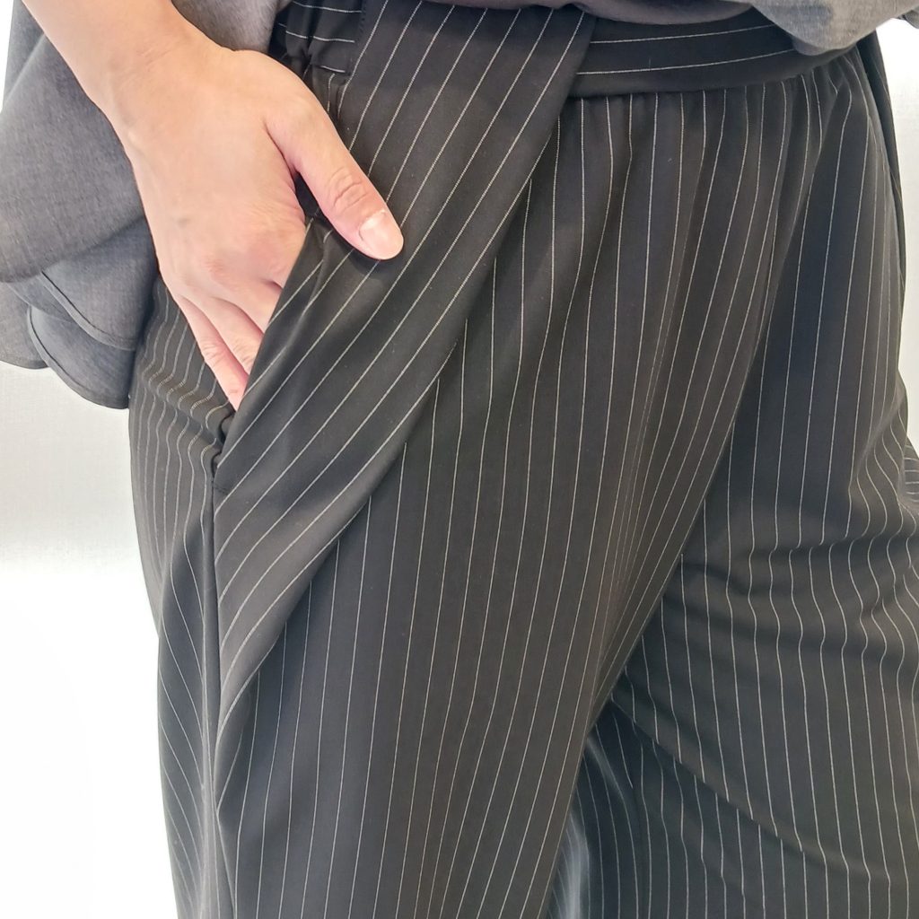 ウエスト部分のタックがモード感を演出するストライプパンツを合わせて、クールでシンプルなモノトーンコーディネートに👌