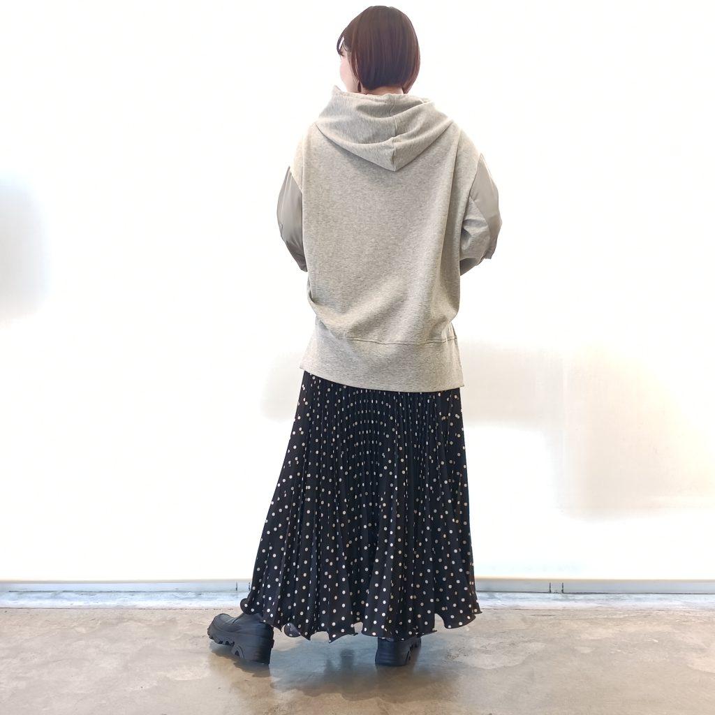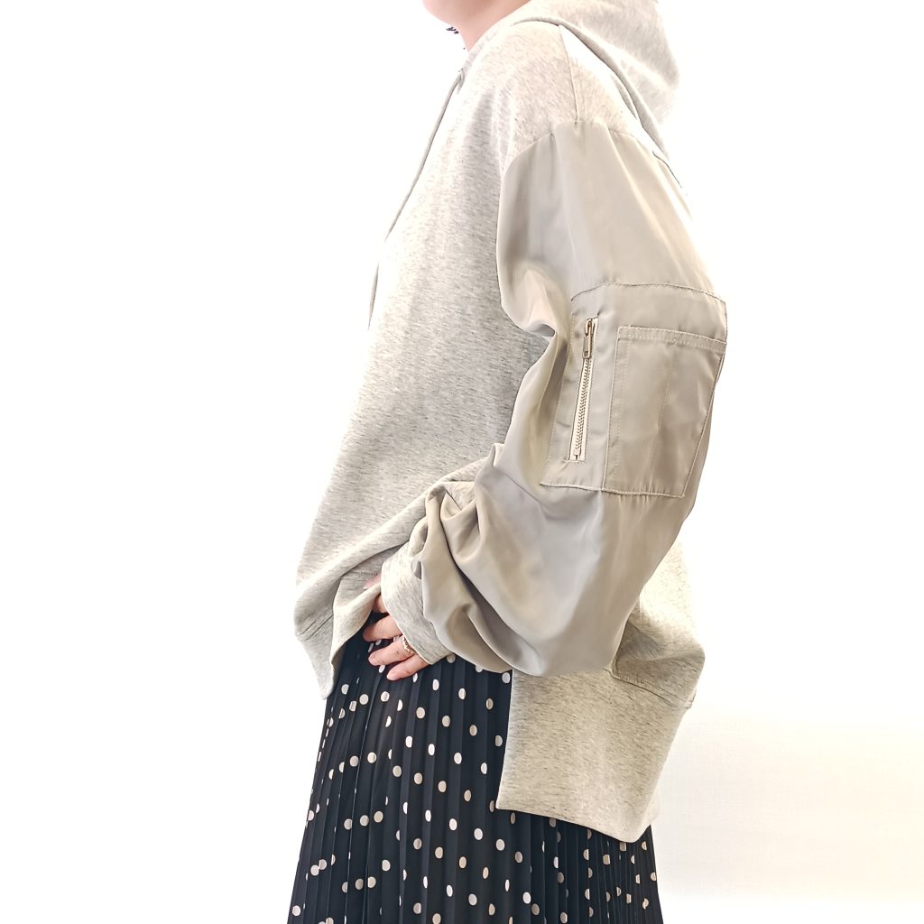 袖部分がナイロン切り替えになっており、MA-1ライクなデザイがポイントのパーカーは甘めスカートとの相性抜群💮