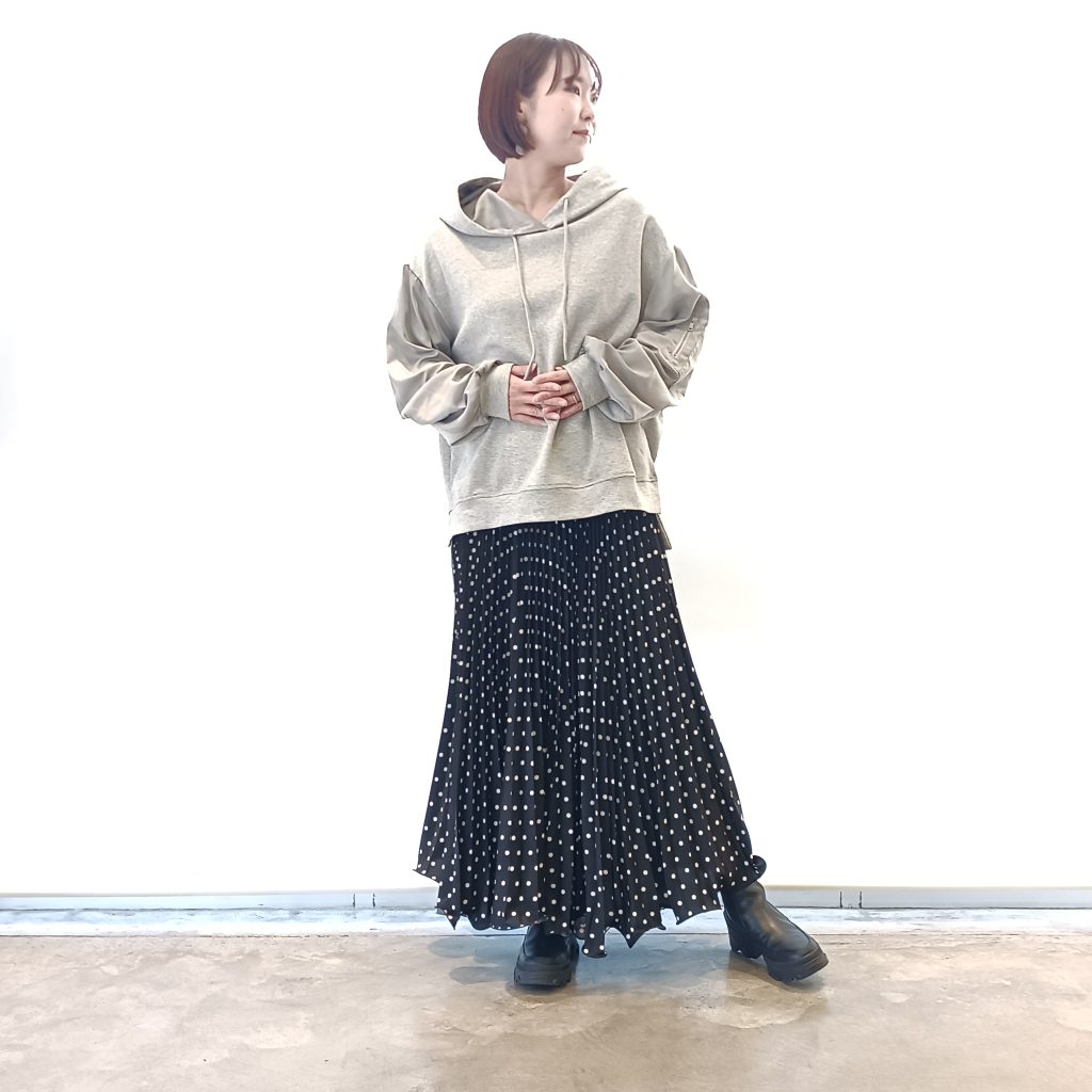 華やかで可愛らしいドット柄プリーツスカートは綺麗なシルエットで、カジュアルアイテムとのバランスを整えてくれます🌼