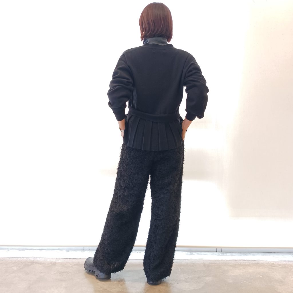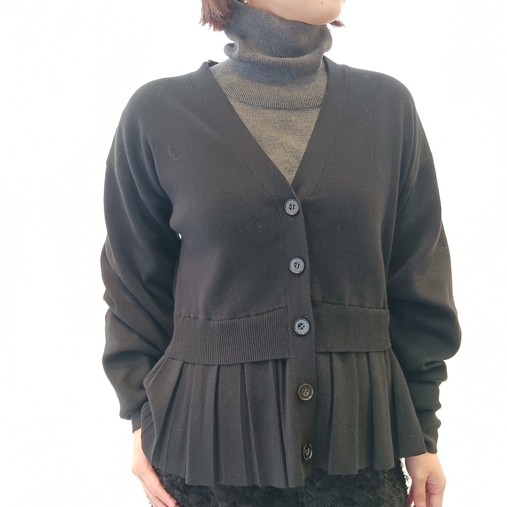 裾に立体感のあるプリーツを施したカーディガンはウエストラインをすっきりと見せてくれる効果があり、上品さと柔らかさを併せ持つ一枚です☺️