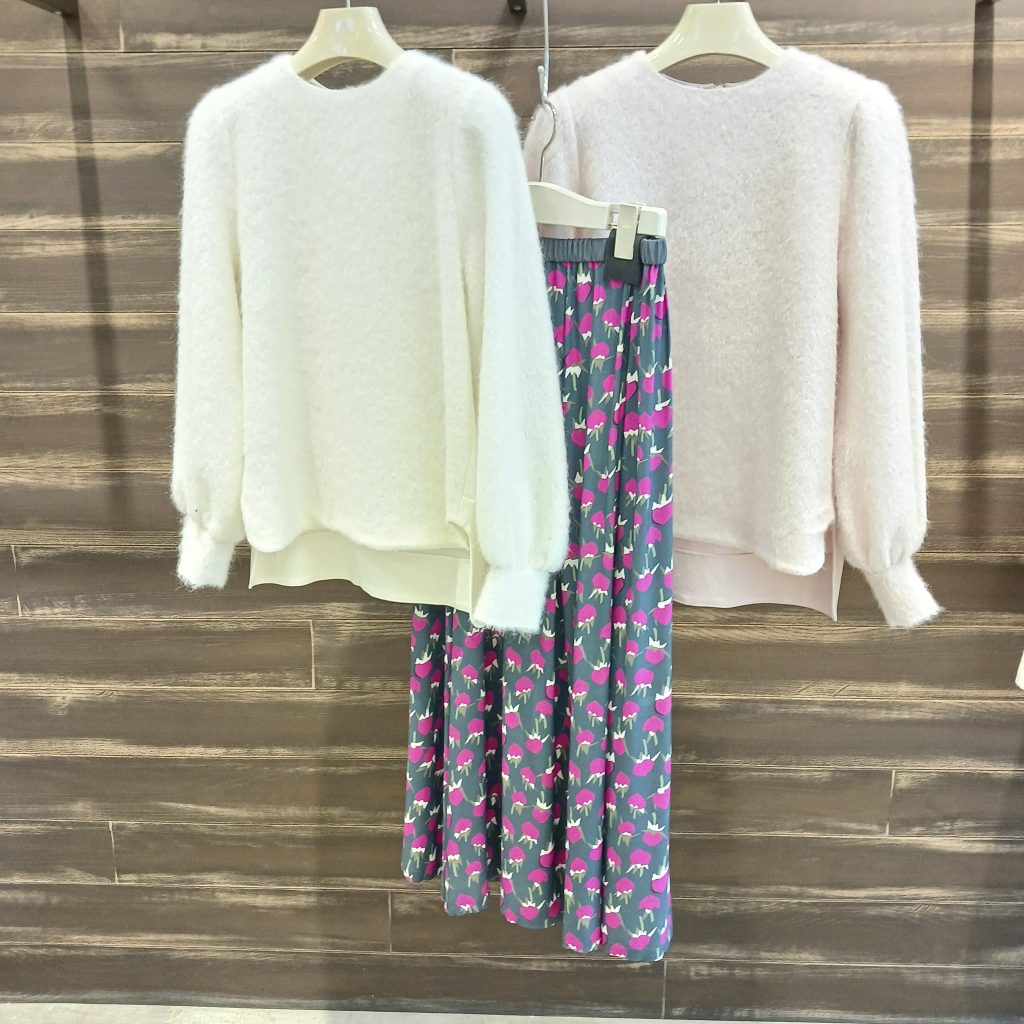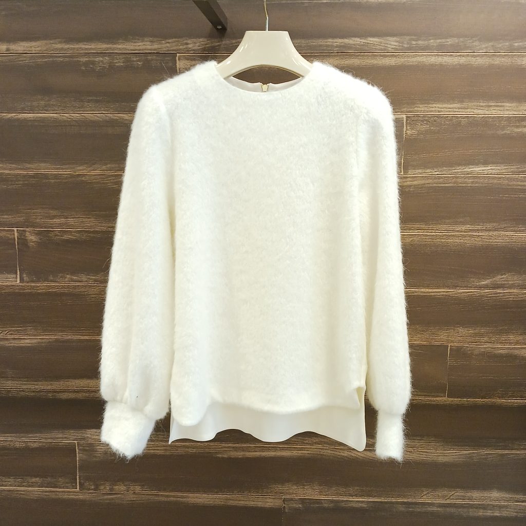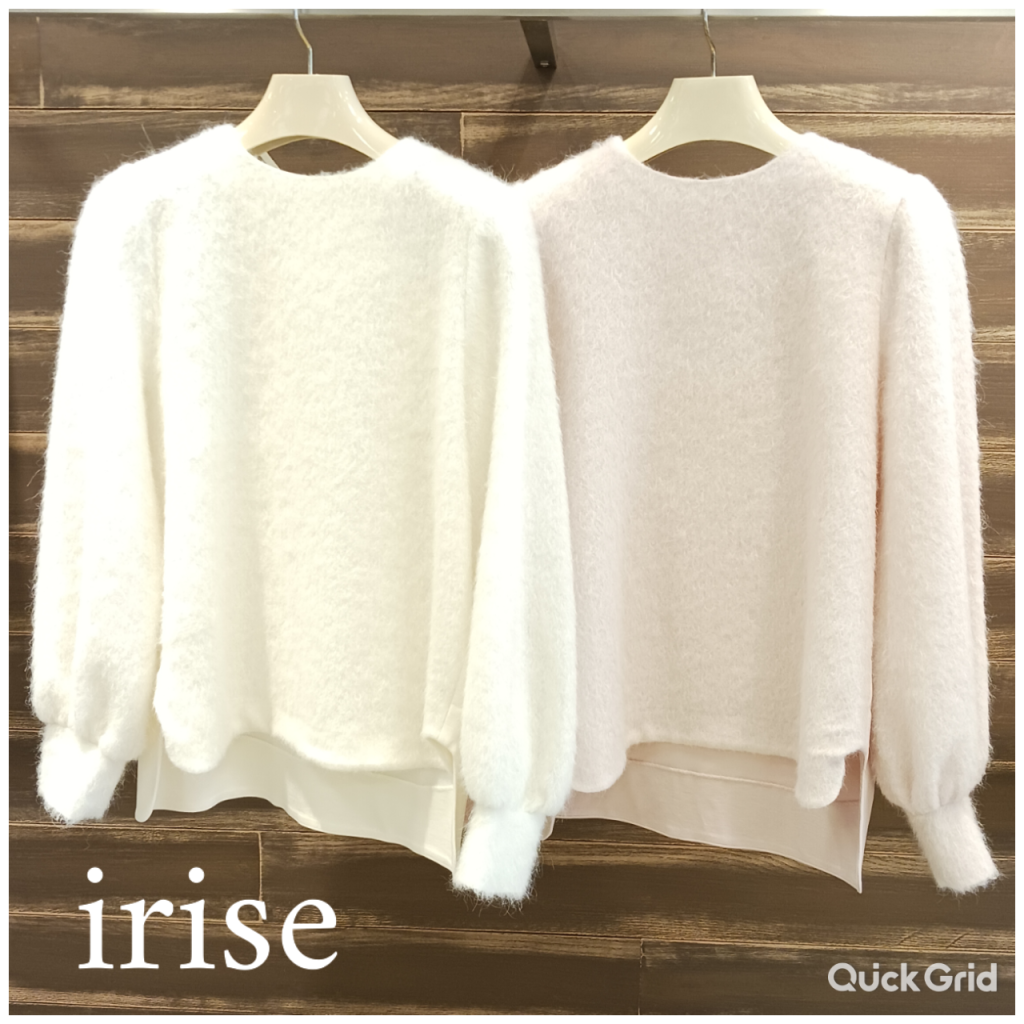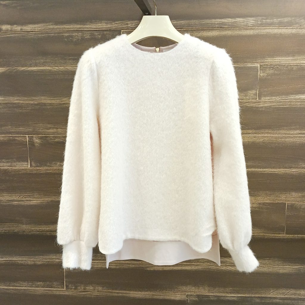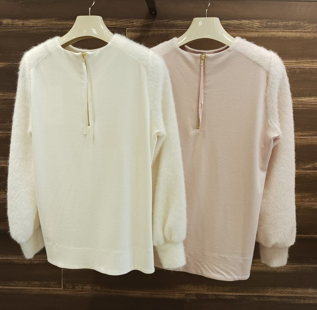 前身ごろ、袖はアルパカ100%のシャギー仕上げで後ろ身ごろははジャージで、軽さと適度なボリューム感のあるファンシーな素材です。