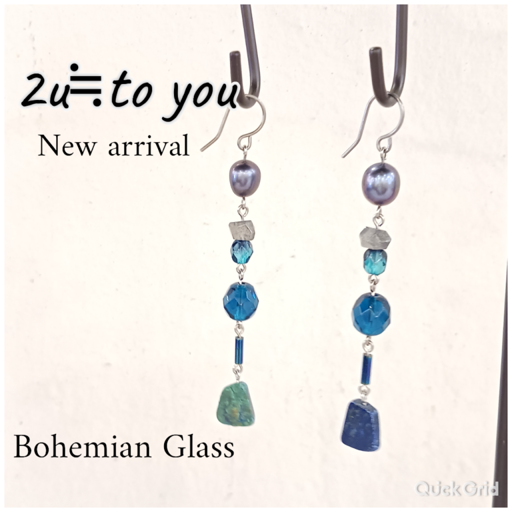 ●天然石mix&ポヘミアンガラスのピアスはメインカラーをブルーグリーンにまとめたシックなデザインです。¥4180(税込)