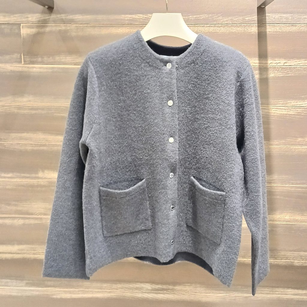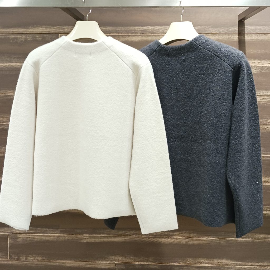 襟元はすっきりとしたラウンドネックで、中にタートルネックや襟付きブラウスなどを合わせて、様々な着こなしをお楽しみいただけます。パンツにもスカートにも合わせやすい丈感で、秋冬に活躍してくれるアイテムです🙆